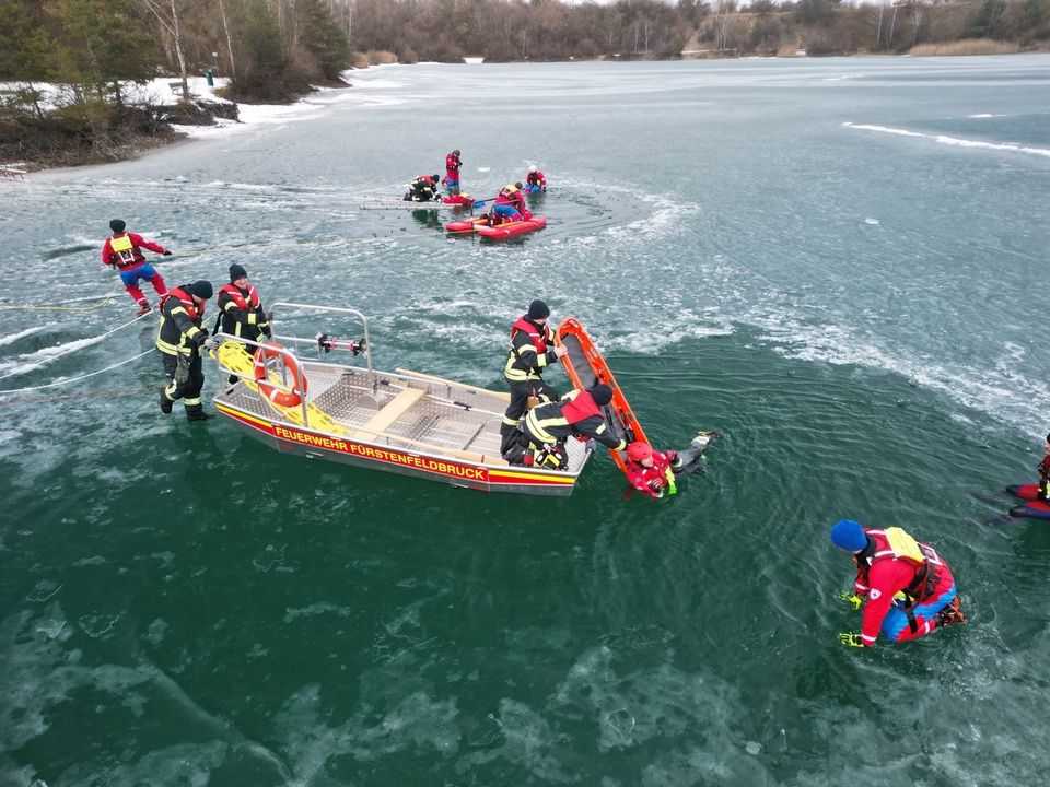 Im Mittelpunkt der Übungen standen sowohl die Selbstrettung als auch die Fremdrettung. Die Einsatzkräfte trainierten den Einsatz verschiedener Eisschlitten, mit denen eine sichere Annäherung an eingebrochene Personen möglich ist. In Fürstenfeldbruck kam zusätzlich ein Boot zum Einsatz, um unterschiedliche Rettungsszenarien praxisnah zu üben.